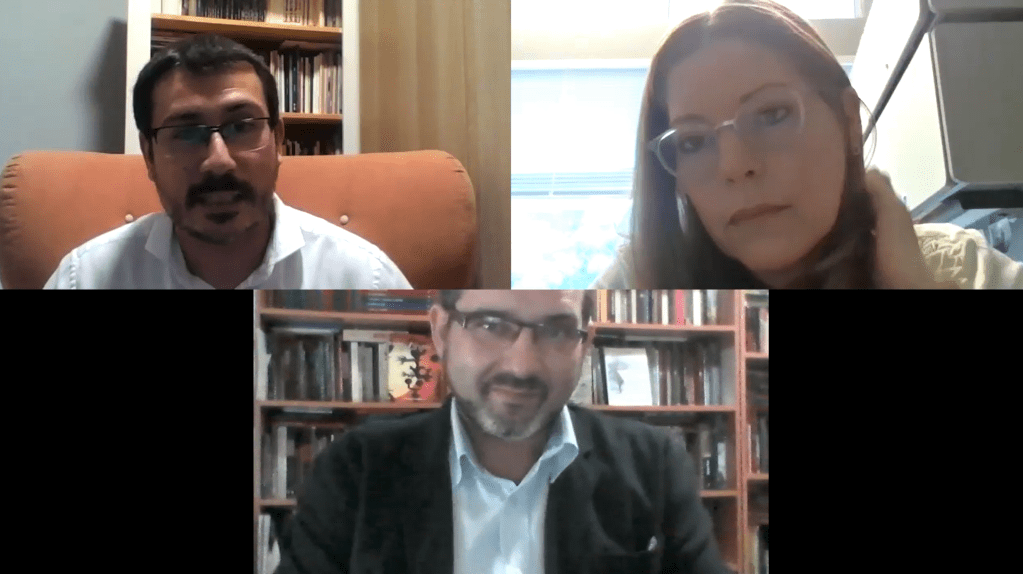 La pandemia por covid-19 sacó la producción de los estudios a la casa. De izquierda a derecha: Con Gregorio Muelas y José Antonio Olmedo López Amor; con Carlos Canales y Marioantonio Rosa (Colaborador de la segunda temporada); con Isamar Anzalotta y Alejandro Medina.