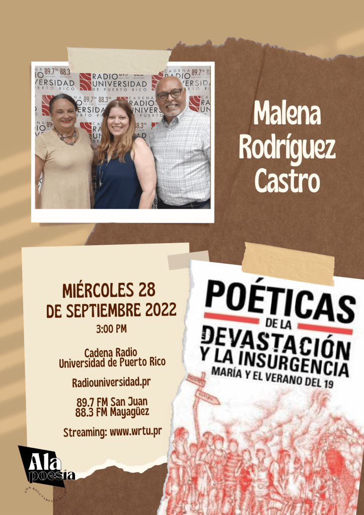 La ensayista e investigadora Malena Rodríguez Castro visita Alapoesía el miércoles 28 de septiembre a las 3:00 p.m. para conversar con Rosa Vanessa Otero sobre su libro Poéticas de la devastación y la insurgencia; María y el verano del 19, una pieza de referencia crítica y estudio cultural de actualidad publicada por Editora Educación Emergente.