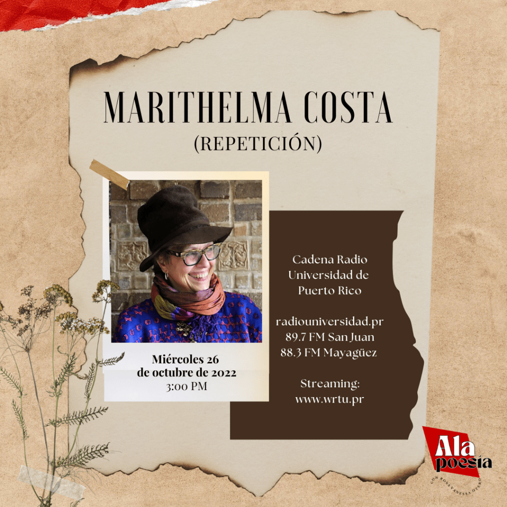 El segundo vuelo de la nueva temporada de Alapoesía, «Marithelma Costa: una viajera en su jardín», restrena este miércoles 26 de octubre de 2022 a las 3:00 p.m. (Zona -4 La Paz). Sintonízanos desde el 89.7 u 88.3 FM o streaming por las plataformas de www.radiouniversidad.pr .