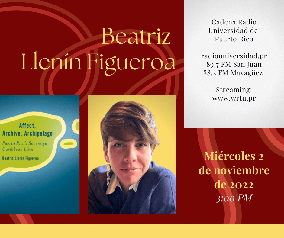 La travesía caribeña de esta temporada en Alapoesía nos lleva hasta Cabo Rojo, donde piensa, ama y edita libros Beatriz Llenín Figueroa, ensayista, poeta y editora-co fundadora de Editora Educación Emergente. El estreno es a las 3:00 de la tarde del miércoles 2 de noviembre de 2022 por el 89.7 y 88.3 FM de Cadena Radio Universidad de Puerto Rico, streaming wrtu.pr.